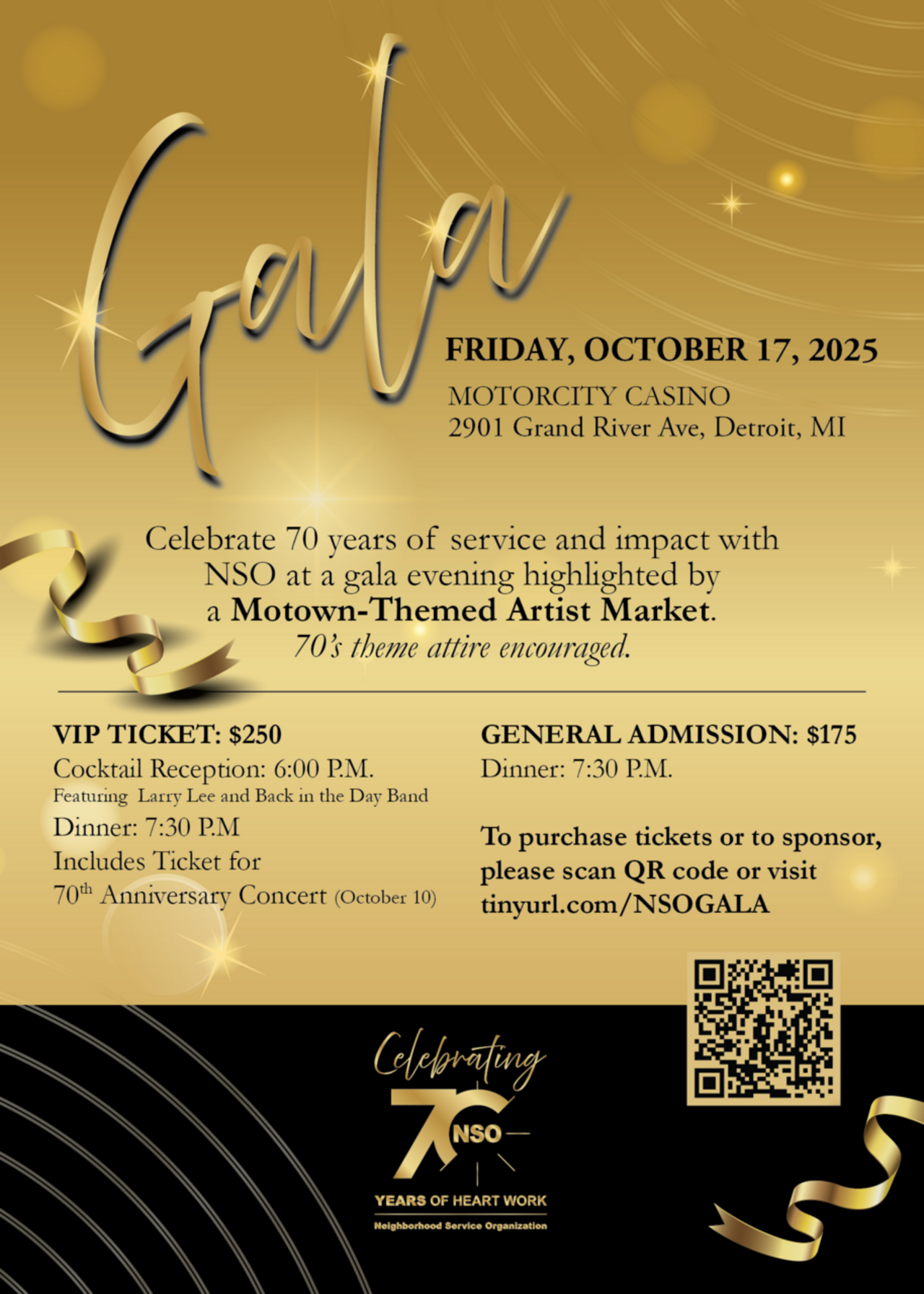 Celebrate 70 years of service and impact with NSO. Join us for a Motown-inspired gala benefiting NSO featuring dinner, live music, and an Artist Market. 70’s theme attire encouraged. All proceeds from the Gala directly support NSO’s mission to provide housing, health, and well-being for Detroit. Your General Admission ticket includes: Admission to NSO’s 70th Anniversary Gala and celebration of seven decades of impact in Detroit. A memorable evening program highlighting NSO’s history, mission, and vision for the future. Elegant dinner service with curated menu selections. Access to the signature program and live entertainment throughout the evening. The opportunity to connect with community leaders, partners, and changemakers who share a commitment to advancing housing, health, and well-being. Join us as we honor the past, celebrate the present, and shape the future, together.